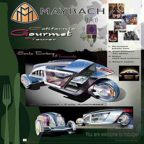 “Maybach California Gourmet Tourer”(梅賽德斯·奔馳北美先進設計中心,Mercedes-Benz Advanced Design of North America)。可以貯藏食物及葡萄酒,配備有微波爐,面向美食家?扇詣玉{駛,酒后駕駛也無需擔心。