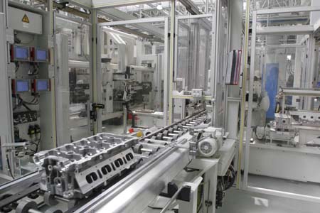 曲軸線(2條)、凸輪軸線、裝試線。涵蓋了所有從0.8升到4.0升,從3缸到V8,從汽油到柴油,18款全鋁發(fā)動(dòng)機(jī)的制造。目前有20萬(wàn)臺(tái)/年的發(fā)動(dòng)機(jī)產(chǎn)能,將來(lái)會(huì)達(dá)到年產(chǎn)50萬(wàn)臺(tái)。