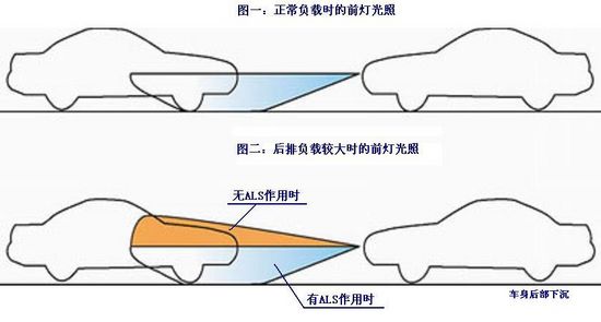 如果說AFS控制的是燈光的"左右"調(diào)整,那么ALS控制的則是燈光的"上下"調(diào)整。通常,汽車大燈的光軸與車身水平線保持一致。如果后排負(fù)載較大,車身水平線難免會(huì)出現(xiàn)上揚(yáng),因此大燈的光軸也隨之上揚(yáng),會(huì)對(duì)對(duì)面車輛的駕者產(chǎn)生干擾。一般駕者都會(huì)對(duì)此深惡痛絕,實(shí)際上,這也正是導(dǎo)致許多車禍發(fā)生的原因。ALS在后排負(fù)載較重導(dǎo)致車身角度上揚(yáng)時(shí),可自動(dòng)調(diào)整光軸傾角,保持光軸水平,避免光軸上揚(yáng)對(duì)對(duì)面來車駕駛?cè)藛T的干擾。