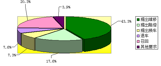 汽車用戶中,針對(duì)汽車質(zhì)量存在的各種問(wèn)題,投訴要求主要由幾方面構(gòu)成:提出維修的占43.3%;提出賠償占17.6%;提出換車占7.3%;提出退車占7.6%;提出召回占20.3%;提出其它要求的占3.9%。要求召回的比例占到第二位,希望引起廠家和政府主管部門(mén)的足夠重視。
