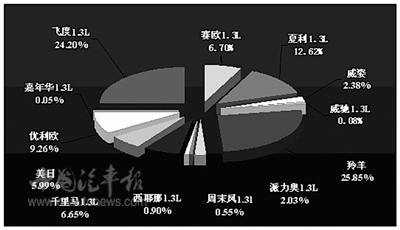 圖為2004年1.3L轎車廠家市場占有率一覽