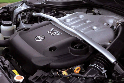 為350Z提供動力的是日產(chǎn)那臺明星發(fā)動機—VQ35DE,這個家伙已經(jīng)賴在全球十佳發(fā)動機的排行榜上長達12年了,用時髦的話,它快成“老妖精”了,探究該機型“成精”的秘訣,似乎也沒有什么特殊的,無非是鋁質(zhì)缸體缸蓋、雙頂置空心凸輪軸、CVTC無級可變氣門正時(和350Z手動檔匹配的發(fā)動機進排氣正時都可變),還有就是在賽車上常用的發(fā)動機微拋光和活塞鍍鉬技術(shù)。不過這臺3.5升V6發(fā)動機確實達到了輕質(zhì)、高效、安靜、清潔的設計目標,因此它廣泛裝備在日產(chǎn)各級別車型上,比如風雅、天籟、Altima、Maxima,當然還有相當厲害的Skyline。