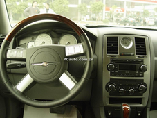 進入到克萊斯勒的內部,首先給你的感覺就是大,不論是前排的駕駛空間還是后面的乘坐空間,我們先來看看前面部分吧。我們這次試駕的300C采用的是深色內飾,這首先比較符合整車的外形部分,看上去有一種莊重感,方向盤和座位采用真皮裝飾,方向盤是四幅式的在上面部分還有桃木裝飾,四幅式的面部采用白色設計,上面還有汽車音響聲音大小等控制按鈕,中部大大的克萊斯勒廠徽鑲在中間,印證著品質和信心。