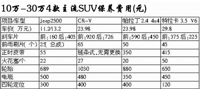 此次調(diào)查的四款不同檔次的SUV及城市休閑車,在維修保養(yǎng)方面價格適中,與自身車價相當。