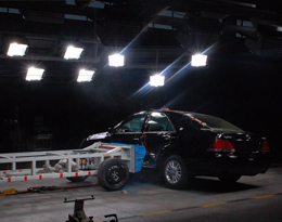 在第二天的側(cè)面碰撞巨大的碰撞聲中,皇冠在移動(dòng)車臺(tái)的運(yùn)動(dòng)方向上挪出了1米多的距離。車輛中柱、底梁組成的側(cè)面保護(hù)力量很有效的抵御住了來(lái)自側(cè)面的沖擊。試驗(yàn)結(jié)束后,移動(dòng)車臺(tái)的前部吸能蜂窩鋁和試驗(yàn)車輛的側(cè)面都發(fā)生了一定的變形。