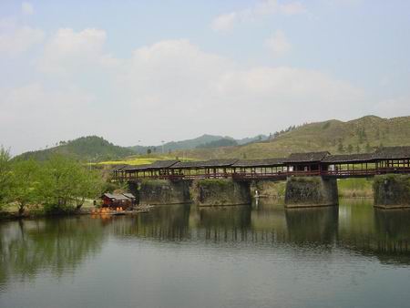 快中午時(shí)分,到達(dá)了婺源的新華鎮(zhèn),這里有中國(guó)最美的橋--彩虹橋。彩虹橋全長(zhǎng)一百四十米,由六亭、五廊構(gòu)成長(zhǎng)廊式人行橋,簡(jiǎn)單稱之為廊橋(有棚頂?shù)臉?。每墩上建一個(gè)亭,墩之間的跨度部分稱為廊,因此,也叫廊亭橋。從遠(yuǎn)處看,亭略高于廊,形成錯(cuò)落有致。彩虹橋前移二十多米,寬度不足六十米,可以節(jié)省大量的人力、物力、財(cái)力,卻偏要建在一百多米的河面上。我們大家知道這樣一個(gè)道理:在管道里,截面越小,水流的速度越快,反之,截面越大,水流的速度越緩。在這條河流上,汛期洪水有多大?大家注意一下第一個(gè)橋墩的尖面,它記載了八百多年的洪水情況。破水的斧面,已形成鋸齒狀。那是八百年以來(lái),每次漲洪水,把山上木頭帶下來(lái),撞擊橋墩形成的。橋墩破損的最高處,真實(shí)記載了歷史的最高水位,幾乎接近橋面。這么大的洪水,在不足六十米河面上建橋,無(wú)疑受到的沖力,破壞力是巨大的。建在最寬處,水流的速度會(huì)變得平緩,相對(duì)來(lái)說(shuō),是建橋的最安全處。